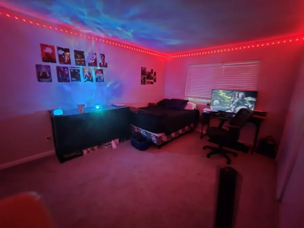 This room by r/General_Setting_4975 is every gaming-obsessed teenager’s dream come true. The LED strip lights transforming the entire space into a pink and blue glow create an immersive gaming atmosphere that’s absolutely on-trend. The simple black bed frame and desk setup provide functional furniture that doesn’t compete with the lighting effects.