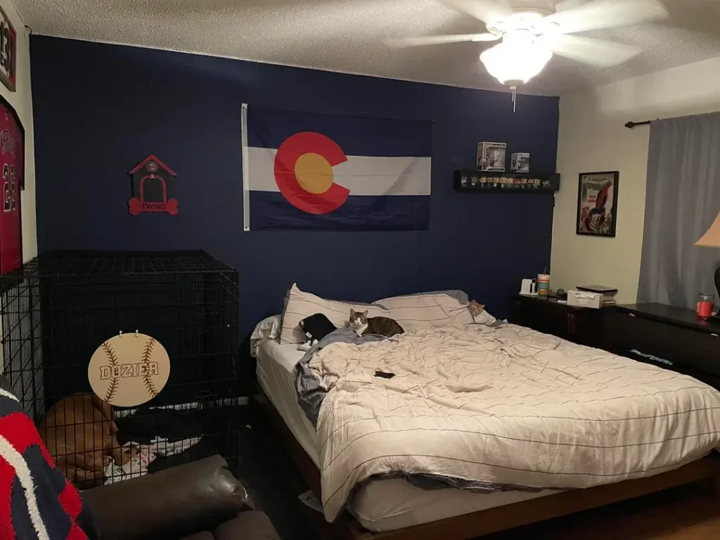 r/ColoradoRiot has created the ultimate room for a Colorado sports fan. The deep navy blue accent wall creates a dramatic backdrop for the Colorado state flag, which becomes the room’s focal point. The white bed with simple bedding keeps things clean and mature whilst allowing the wall decor to shine.