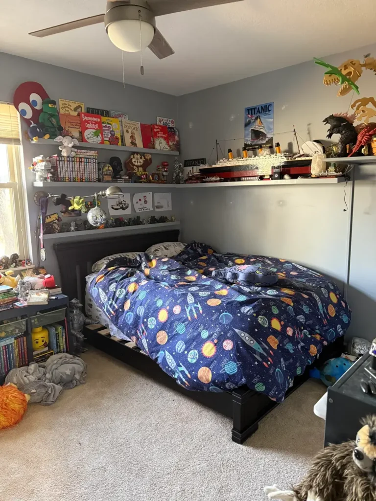 This room is an absolute dream for any budding astronaut or space enthusiast. r/hyperrealhappymeal‘s son’s room features the perfect blend of educational elements and playful design. The grey walls provide a neutral backdrop that won’t compete with the vibrant space-themed bedding featuring planets, rockets, and celestial bodies.