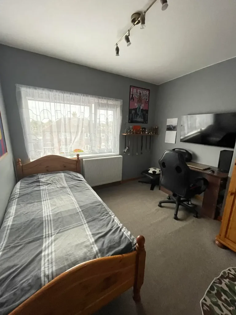 The genius of this room lies in its zoning. The gaming and study area features a proper gaming chair and desk setup with a wall-mounted TV – creating a dedicated space for homework and entertainment that’s separate from the sleeping area. The grey and white plaid bedding keeps things simple and grown-up, moving away from childish patterns whilst still adding visual interest.