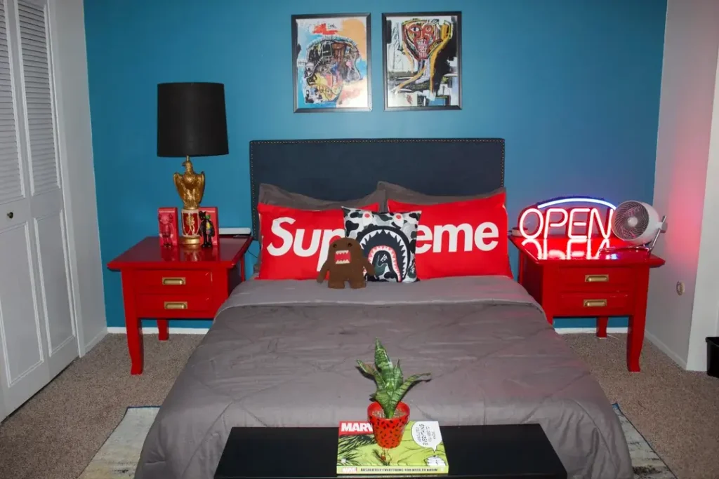 This room is for the boy who knows exactly what he likes and isn’t afraid to show it. r/welp-itscometothis has created an incredibly bold space centred around streetwear culture, featuring Supreme bedding and a striking turquoise accent wall that absolutely pops against the neutral surrounding walls.