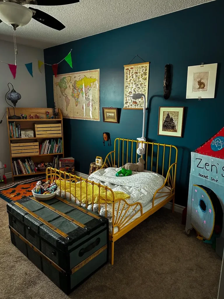 r/HipsterBefore_You has created something truly special here with this 3-year-old’s “antique” big boy room. The deep teal accent wall is absolutely stunning and provides a sophisticated backdrop for the gallery wall featuring vintage-style maps, prints, and that interesting wooden mask. The yellow vintage-style metal bed frame is the room’s showpiece – it adds character and charm whilst being practical and sturdy.