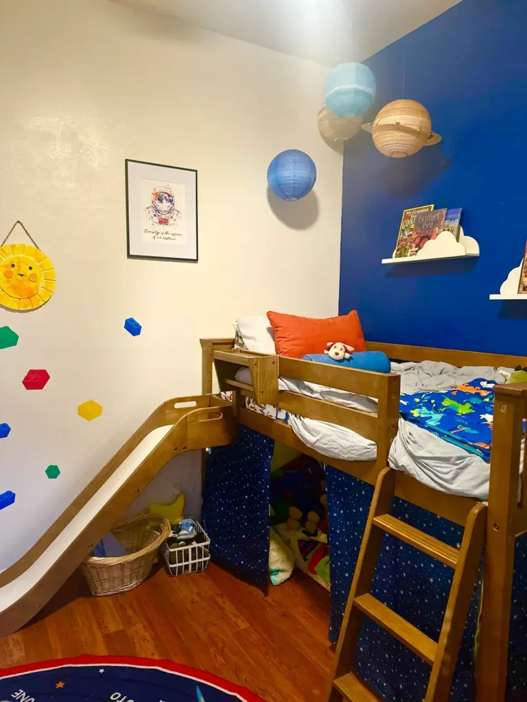r/bitchinawesomeblonde‘s 5-year-old’s room is a masterclass in creating an educational yet playful environment. The space theme continues here with hanging planet lanterns that serve as both decoration and a learning tool. The bold blue accent wall provides a dramatic backdrop for the cloud-shaped shelves and space-themed artwork.