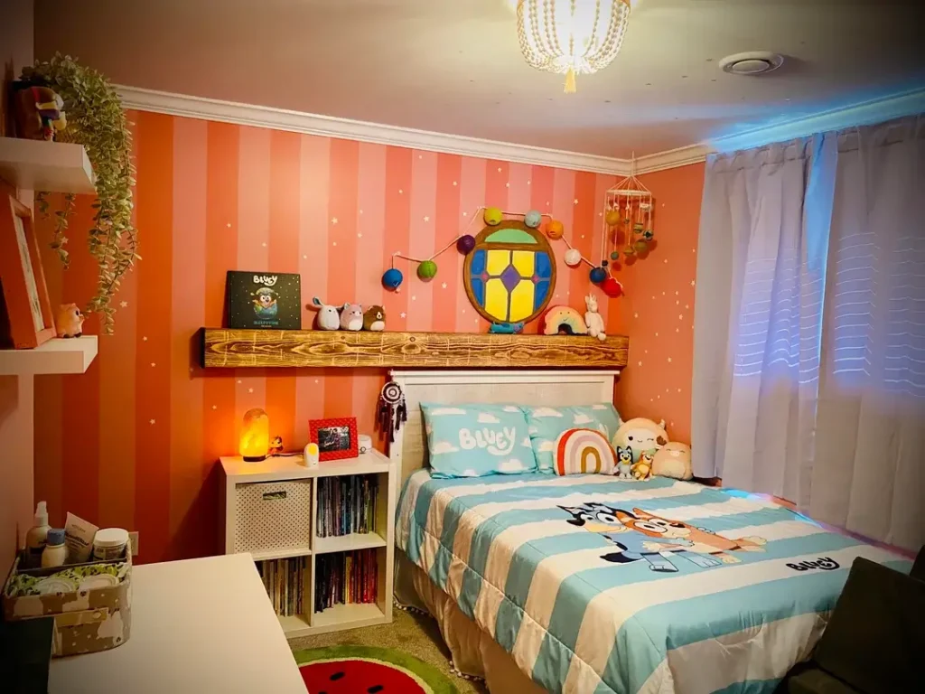 The custom wooden headboard with built-in shelving is both practical and adorable, providing storage for books and display space for favourite toys. The Bluey-themed bedding ties everything together beautifully. But what really makes this room special is the attention to detail – the beaded chandelier adds a touch of elegance, whilst the stuffed animals and rainbow pillow bring softness and comfort.