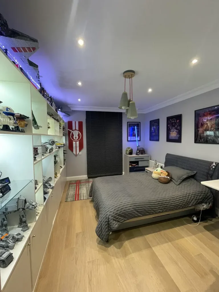 The low-profile grey bed keeps the focus on the impressive display wall, whilst the wooden flooring adds warmth to balance the cool grey tones. The framed Star Wars posters are displayed like art – because that’s exactly what they are in this space. Notice how everything has its place: models, collectibles, and even what appears to be a Republic banner all have dedicated display areas.