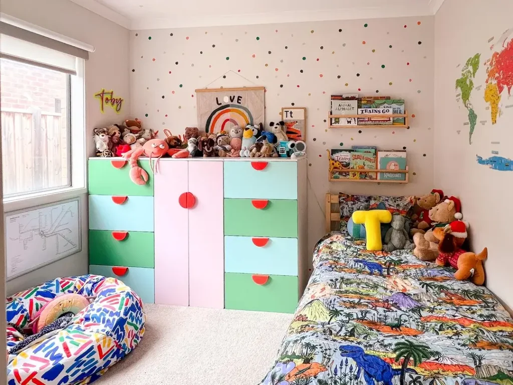 This joyful room created by r/cjinoz proves that boys’ rooms don’t have to stick to traditional blue palettes. The soft blush pink walls covered in multicoloured polka dot decals create a cheerful, energetic atmosphere perfect for a young child. The custom dresser painted in mint green, pink, and white with watermelon-slice handles is an absolute showstopper.