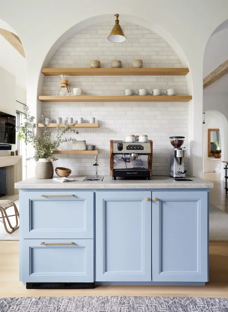 The powder blue base cabinet with gold knobs anchors the composition without competing with the arch. The color choice brings softness to what could read as stark with all that white tile and wood.