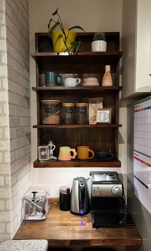 For narrow spaces between doorways or at the end of a hallway, deep shelving with a small countertop section can create a functional coffee station that takes up less than two feet of width.