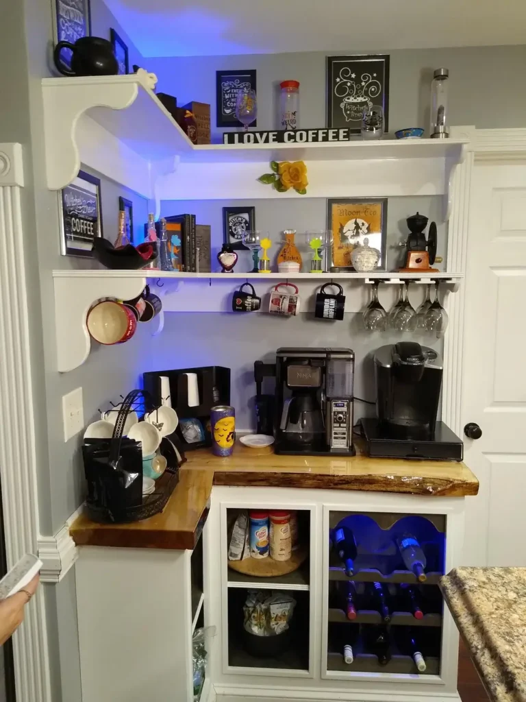 The live-edge wood counter adds organic texture against the painted shelving. Multiple coffee makers a standard drip, a Keurig, and an espresso machine sit ready on different levels.