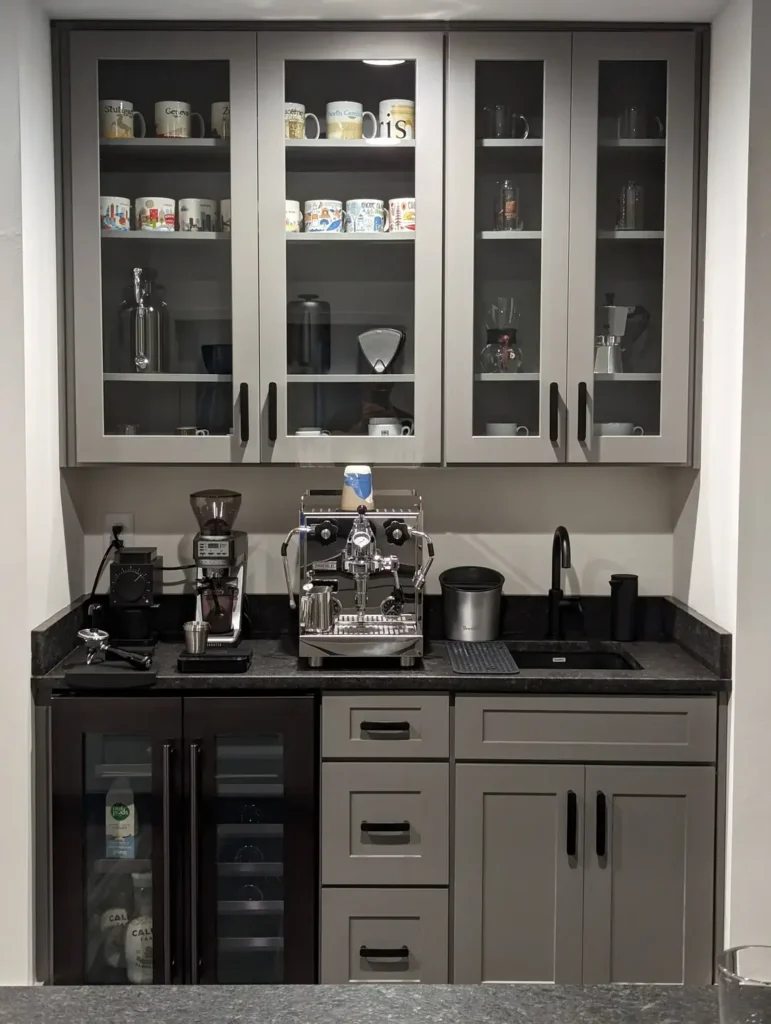 This built-in uses gray shaker cabinets with glass uppers that display coffee mugs and specialty glassware against a black interior.