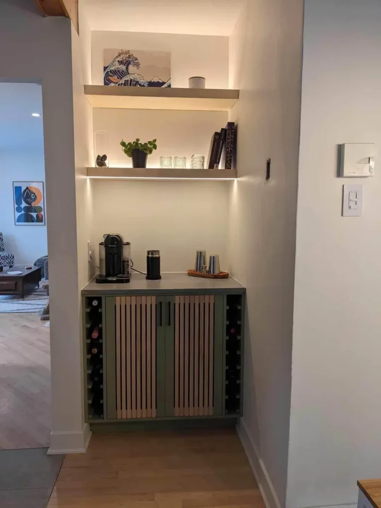 The best built-in coffee bar ideas work because they solve your specific spatial challenge while matching how you actually make coffee. That might mean a full pantry transformation with floor-to-ceiling storage, or it might mean four shelves in a narrow alcove.