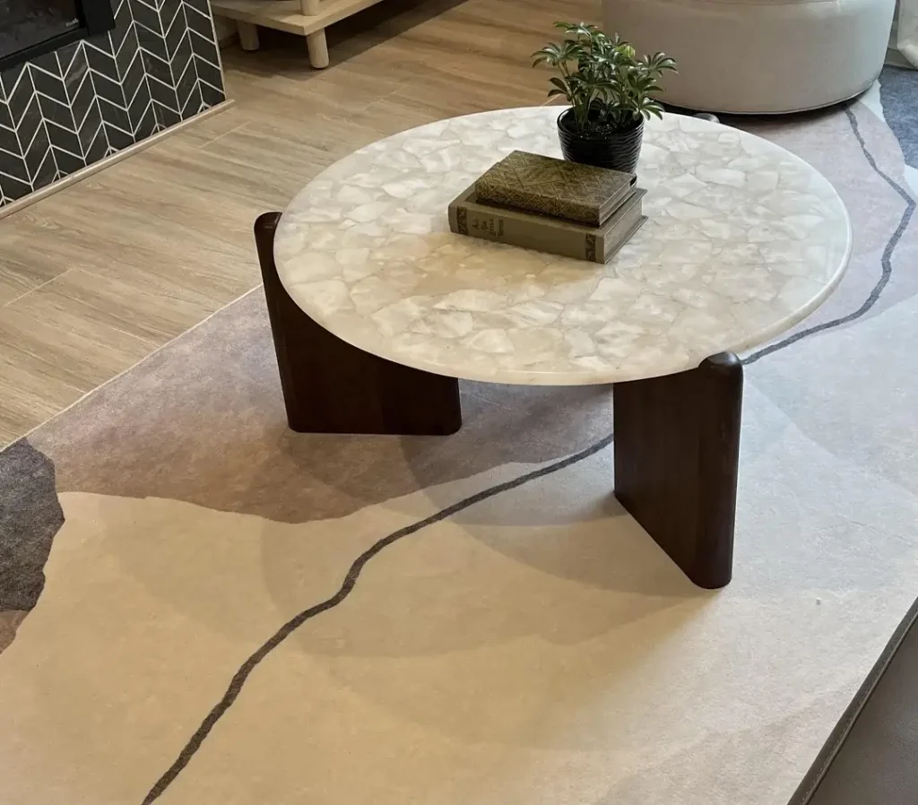 The takeaway: If your round coffee table has a decorative surface, treat the table itself like art. A small stack of books with spines facing the same direction and a single-stem vase is genuinely all you need. Don’t clutter something that already earns attention on its own.
