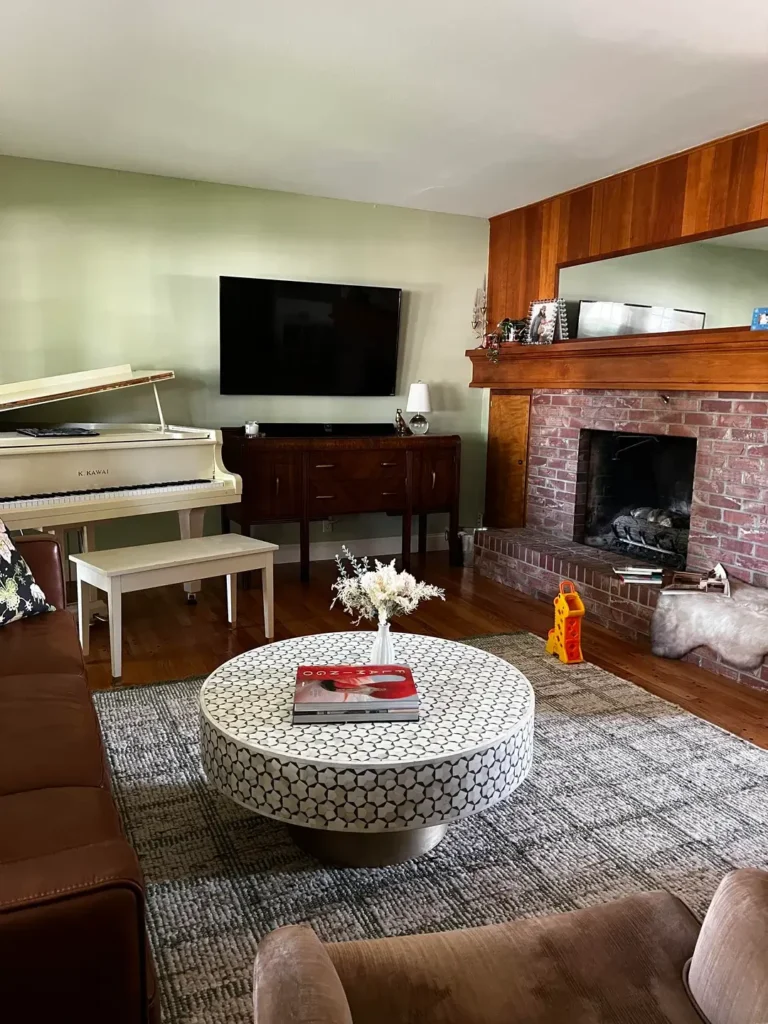 The room has plenty happening elsewhere a white grand piano, a brick fireplace, walnut cabinetry, sage green walls. This table bridges all those elements without competing with any of them. The minimal styling quietly says “someone with taste lives here” without shouting about it.