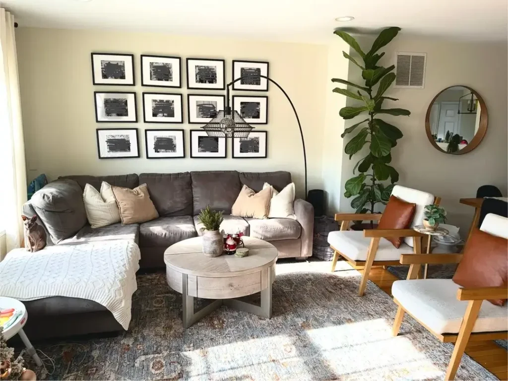 Now look at the room around it: a 12-panel gallery wall in black and white frames, a large fiddle leaf fig tree, an arc lamp with an open cage shade, and a mix of accent chairs in warm leather and linen. There’s a LOT of visual energy happening.
