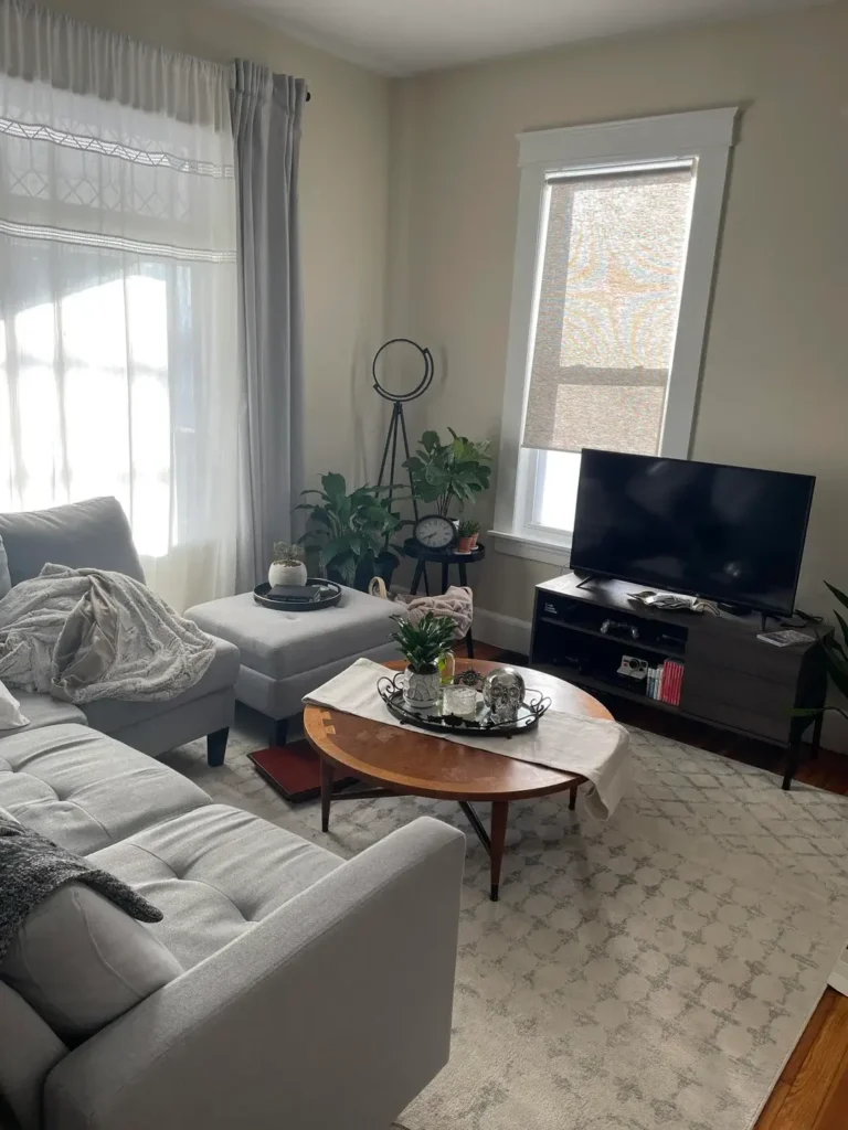 The room itself leans into a quiet, lived-in vibe light gray upholstery, white diamond-pattern rugs, houseplants grouped in a corner. The table decor feels personal and slightly eclectic, which fits perfectly.