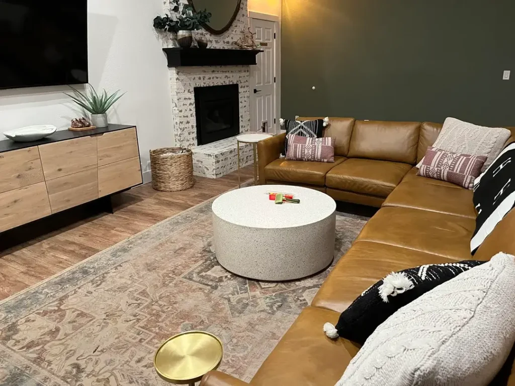 u/jackjackj8ck paired a chunky white terrazzo drum table with a caramel leather sectional, an olive green accent wall, a white brick fireplace, and layered boho textiles in black, white, and dusty pink. The table has almost nothing on it just a couple of small objects that look like they were left behind by everyday life.
