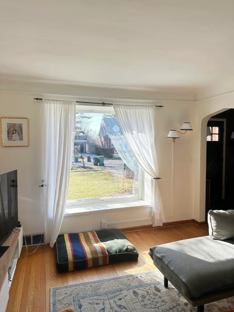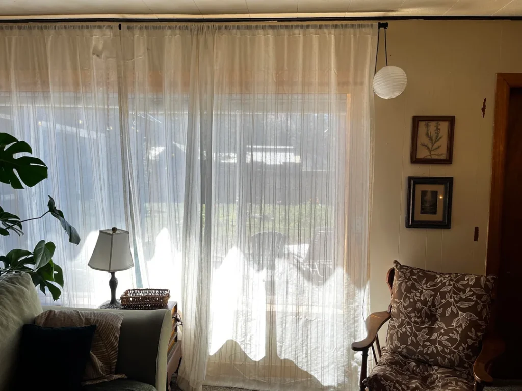 A Redditor installed off-white sheer panels across an entire window wall using a minimal black rod. Not just framing the glass. Spanning the entire wall. The result is this gorgeous flood of soft natural light that makes everything in the room glow. The monstera plant in the corner looks like it’s having the best day of its life.