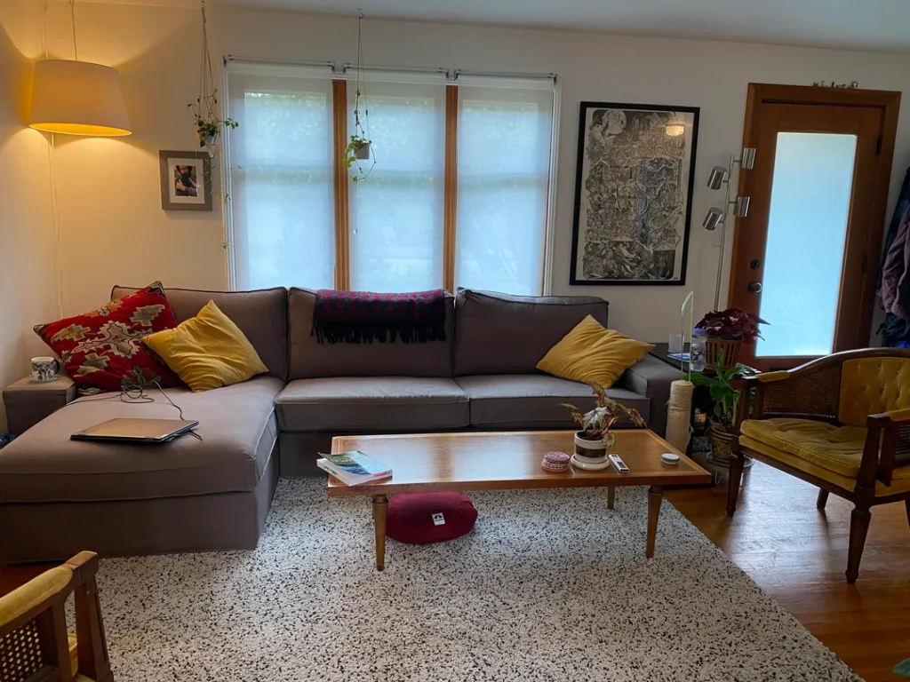 A Redditor chose white curtains with a bold black abstract arch print accented with orange circles. Very mid-century modern, very retro-pop. The rest of the room stays deliberately chill with a grey sectional, warm hardwood floors, a fluffy cream rug, and an impressive collection of trailing pothos cascading down the wall.