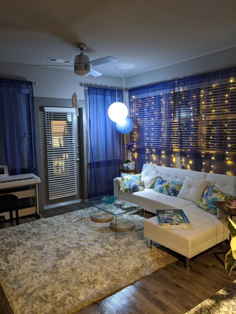 A Redditor on r/CozyPlaces hung navy blue sheer curtains across an entire window wall, then wove warm fairy lights directly behind the fabric. The evening effect? Think starry night meets underwater cave. The warm amber glow bleeding through that deep blue sheer is genuinely magical.