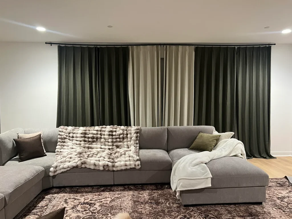 A Redditor installed a continuous ceiling-mounted track across an entire wall and used two fabric types: deep forest green panels on the outer edges and natural linen panels in the center. The layering effect looks almost like stage curtains. The green frames the lighter panels and gives the whole wall incredible depth. A large grey sectional with olive and brown cushions ties everything back to the curtain palette.