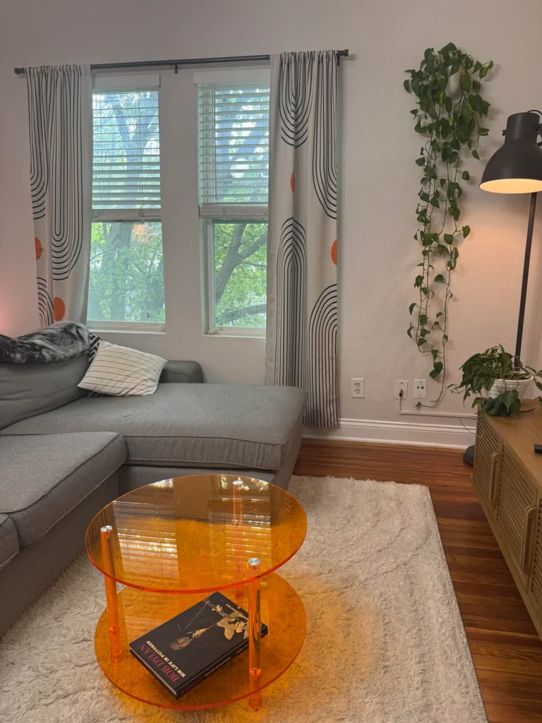 Here’s what makes this room feel so pulled together. The orange dots in the curtain print connect directly to the amber acrylic coffee table sitting in front of the sofa. It’s not an accident, but it’s not precious either. It just feels like someone who genuinely enjoys decorating put this space together.