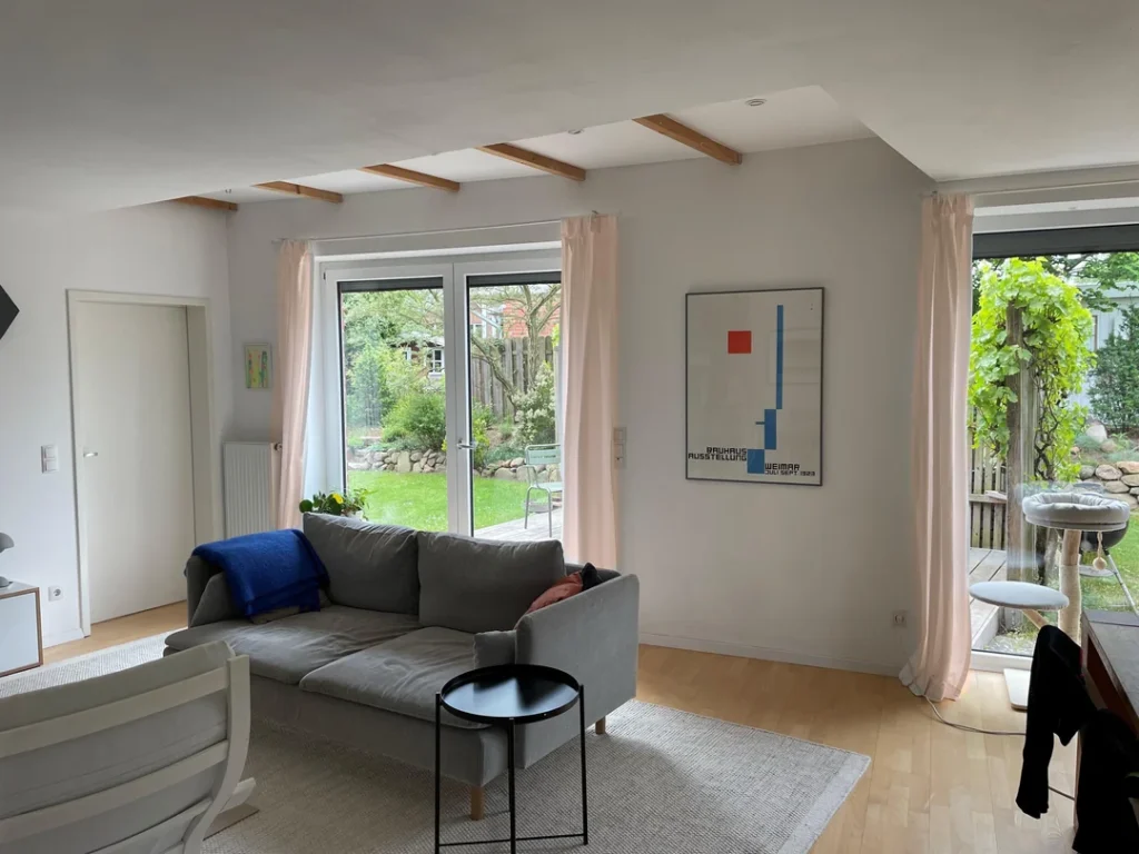 A Redditor paired soft blush pink linen curtains with white walls, light wood floors, exposed wooden ceiling beams, and a grey sectional. A Bauhaus exhibition poster on the wall adds the one bold graphic punch the space needs. The pink curtains appear on both sides of the room, flanking French doors and a terrace entrance. They stay open all the time because their job is purely decorative.