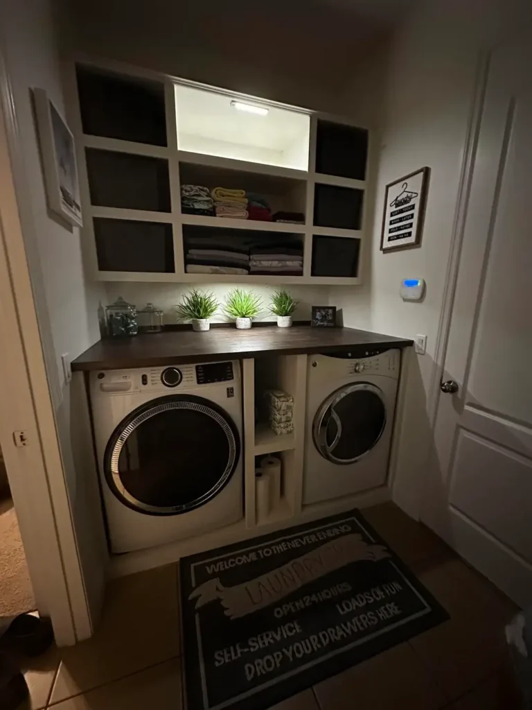 The built-in nook for the washer and dryer is framed by white cubbies that serve as both storage and architectural detail. r/TWHO4LIFE installed a dark wood countertop over the machines that extends past them to create a substantial folding and sorting surface. Above that, open white shelving displays folded towels and decorative items in the “live-in” style that makes a room feel used rather than staged.