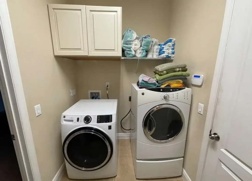 This kind of setup requires careful measurement of your appliances before building or ordering cabinets. Front-loading machines need door clearance, and you need to account for hose connections and venting that extend beyond the machine’s basic dimensions.