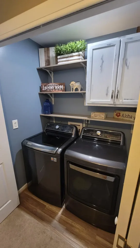 What makes this setup work is the restraint. Instead of cramming storage everywhere possible, they kept it minimal and focused on what actually gets used during laundry day. The blue detergent bottles are visible but contained, and there’s clear space to move around without bumping into things.