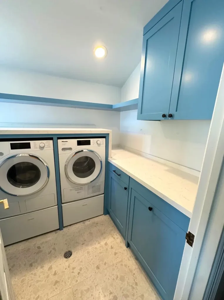 The Miele appliances sit on pedestals beneath white countertops with storage drawers below. r/customwoodworkscw extended the blue cabinetry to the upper walls, creating visual continuity while providing abundant closed storage for supplies and cleaning tools. The terrazzo-style flooring in soft beige with darker aggregate adds subtle pattern that hides dirt while maintaining the room’s overall calm aesthetic.