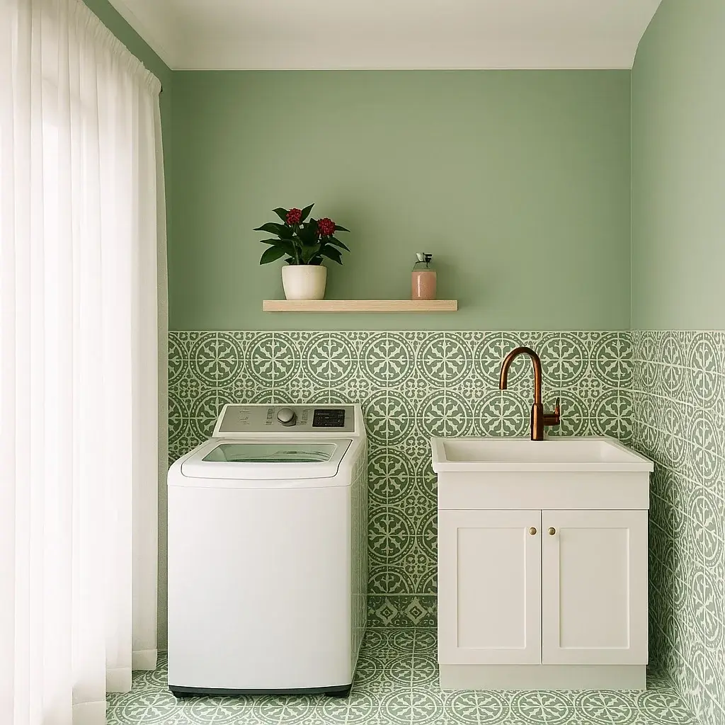 The sage green walls create a calm atmosphere that makes laundry feel less like a chore and more like time in a spa. r/amylouise0185 paired those walls with an intricate geometric tile backsplash in matching green and cream tones. The pattern adds visual interest without overwhelming the small space—the key is keeping the rest of the design elements simple.