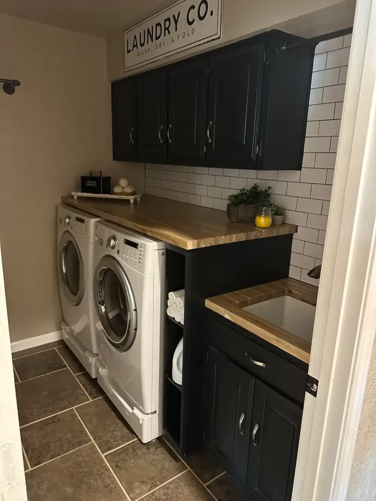 Black cabinetry in laundry rooms remains uncommon enough to feel distinctive. This space combines those dark cabinets with natural wood countertops and white subway tile to create a modern farmhouse aesthetic.