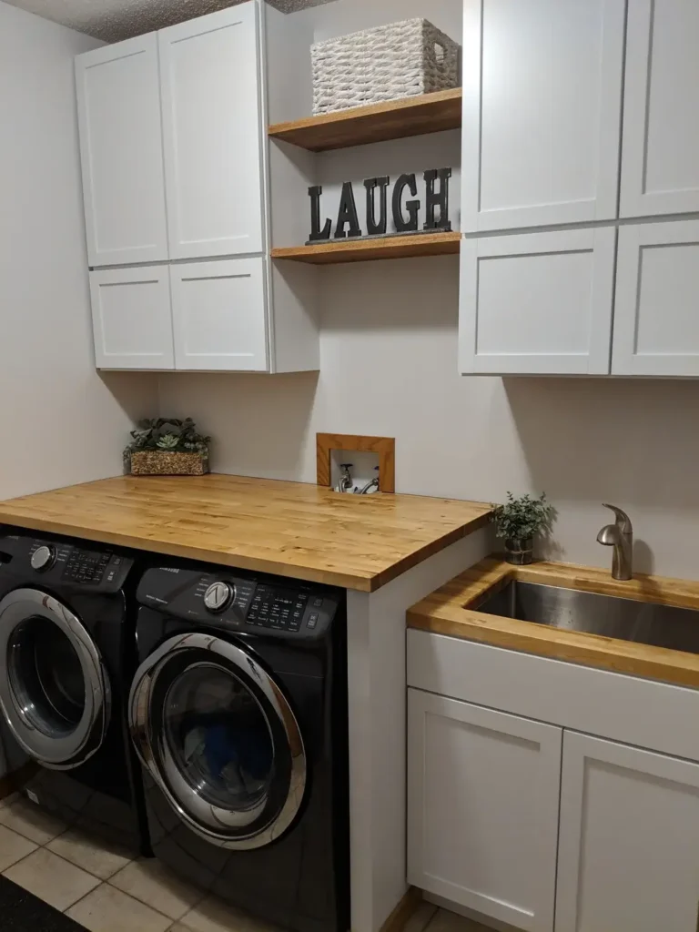 r/platofzion paired those cabinets with a light wood butcher block countertop that introduces warmth and provides a durable folding surface. The combination of painted cabinets and natural wood is having a moment in home design, but it works here because both materials are practical choices for laundry rooms—paint wipes clean easily, and butcher block withstands the moisture better than you’d expect.