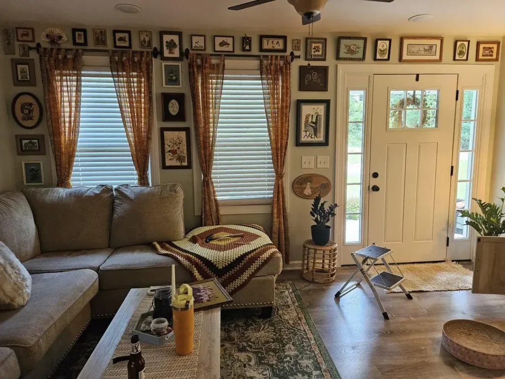 Warm, patterned curtains add just enough detail to feel special without fighting with an incredible gallery wall. That restraint pays off big time.
