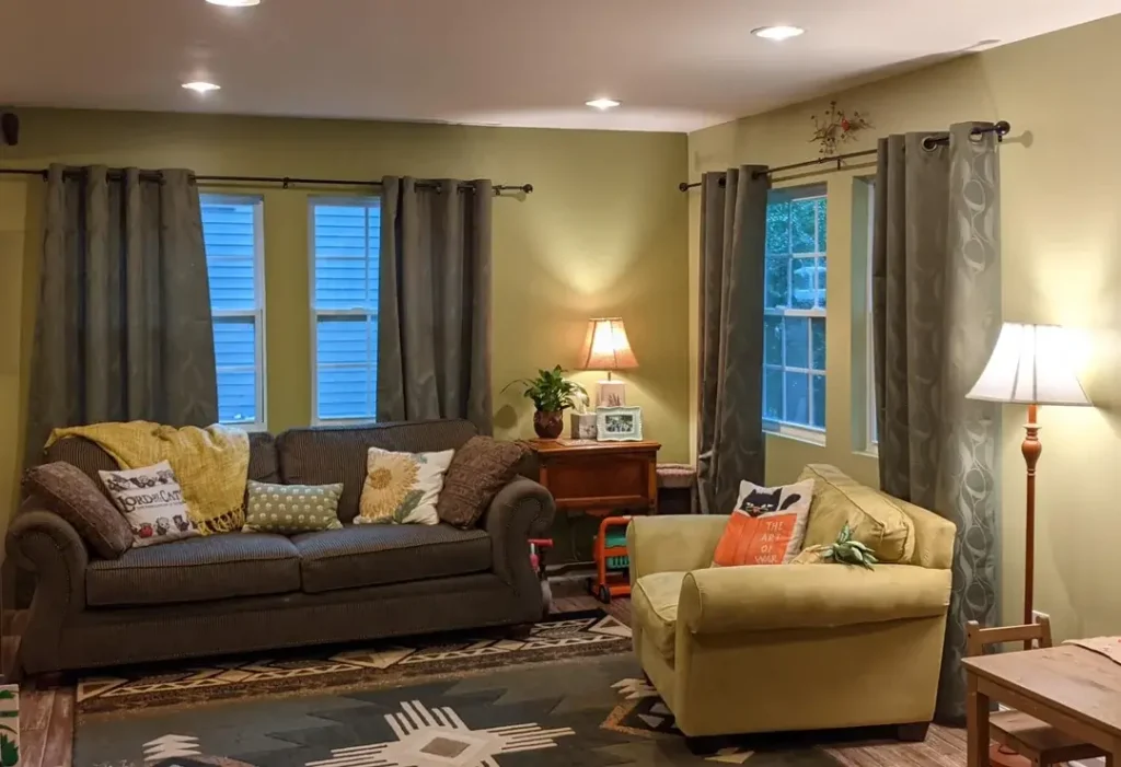 Gray-green curtains bring serious earthy vibes to warm-toned spaces. r/mrsmistoffelees02 demonstrates how this color feels both modern and timeless against olive and golden yellow walls.