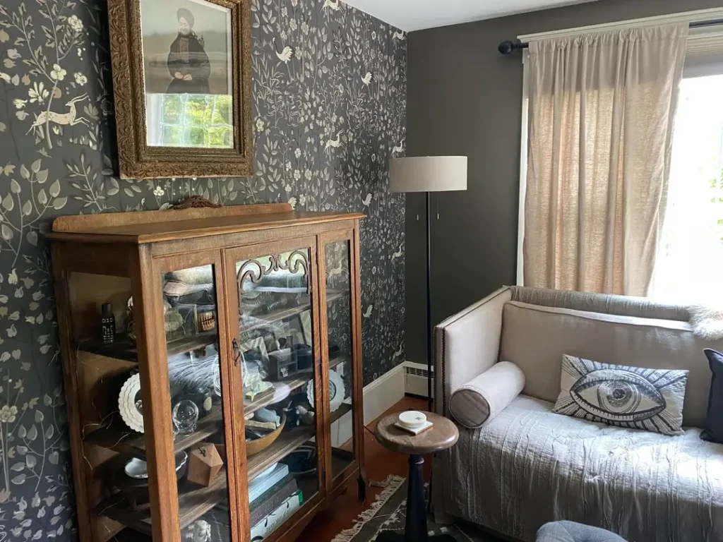 This space pairs moody floral wallpaper with simple, neutral curtains. The result? Sophisticated farmhouse that feels both vintage and surprisingly modern. It shouldn’t work, but it absolutely does.