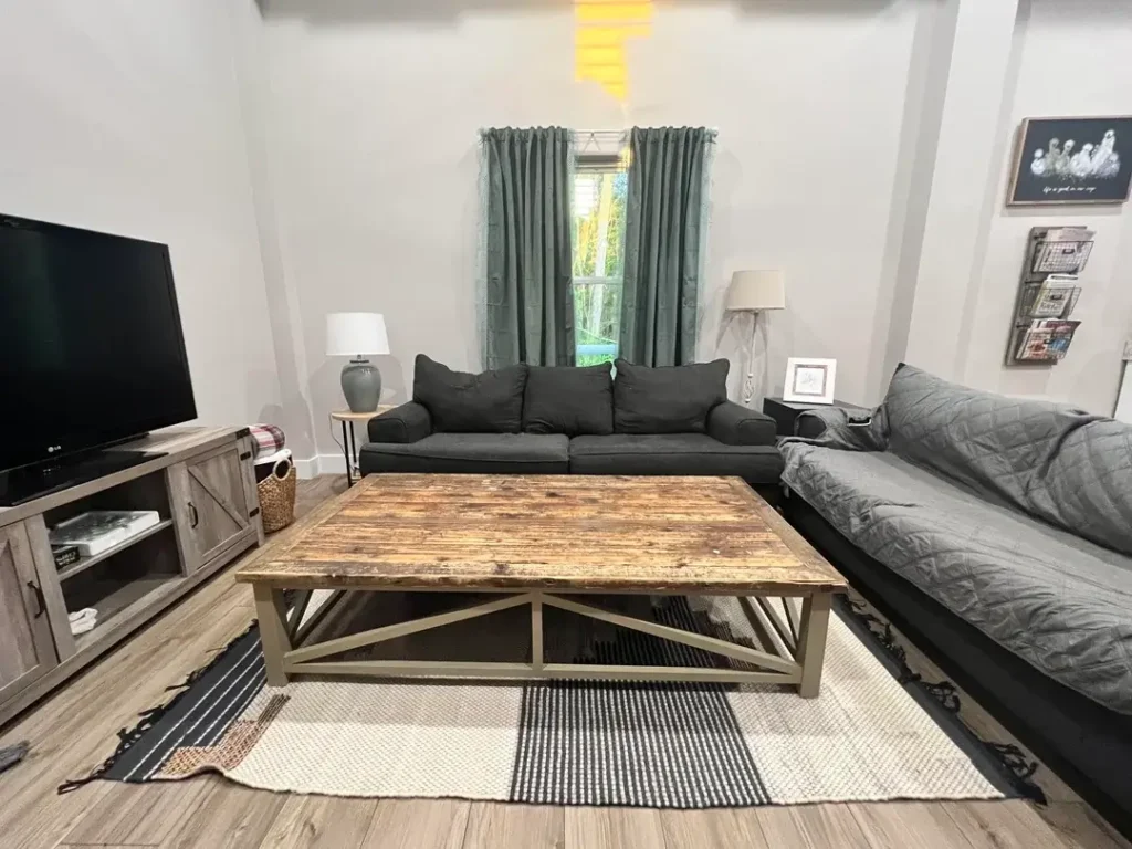 The curtains complement the throw pillows without matching them exactly. That’s intentional. Farmhouse works best when things feel collected, not bought as a set from the same store on the same day.
