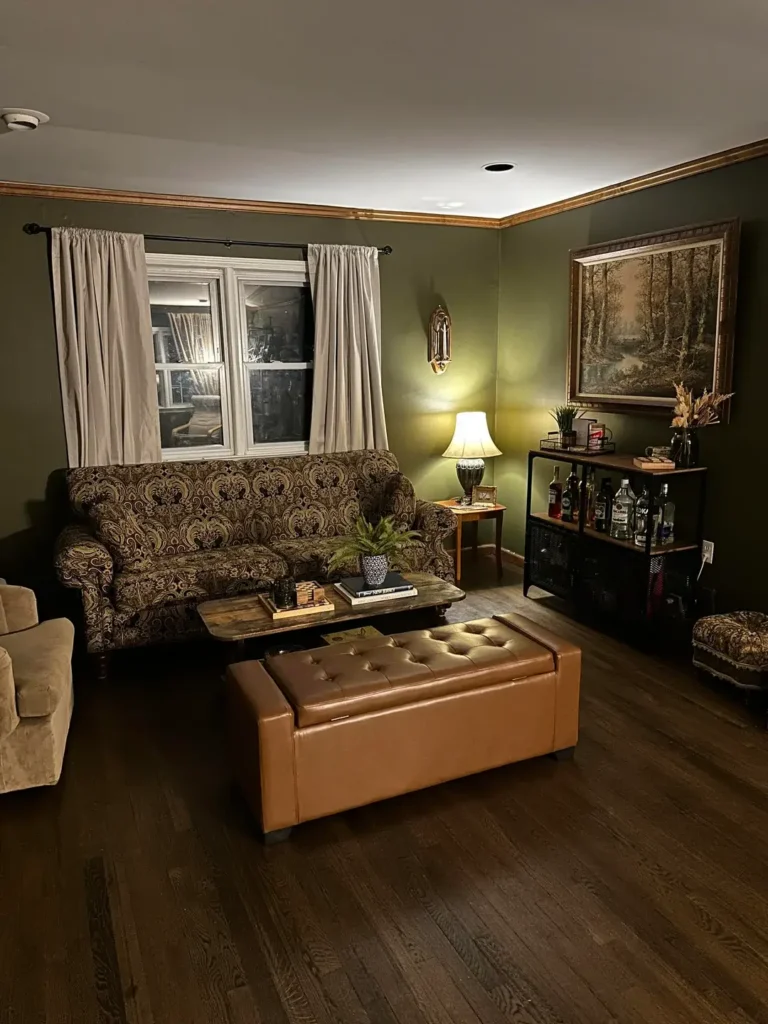 Deep olive walls with neutral curtains create something enveloping and grounded. r/brightsideofmars shows what farmhouse looks like when you want serious weight and presence.