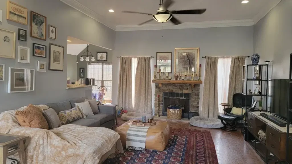 These taupe curtains hit that sweet spot—not too warm, not too cool. When you’ve got a gallery wall, a fireplace, AND a mix of furniture styles competing for attention, your curtains need to play a supporting role.