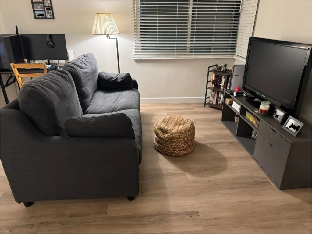 This living room from r/ItsAnonCat is almost entirely empty. And it still feels comfortable, functional, and put-together. That tells you something really important about furniture selection in first apartment decorating.