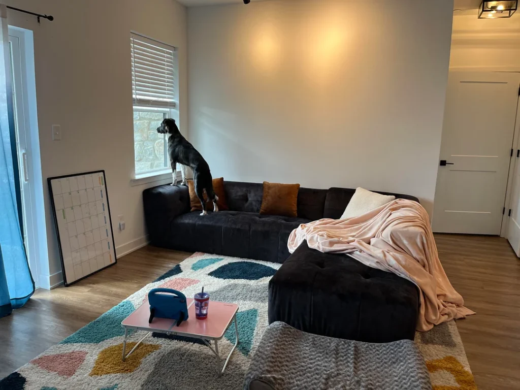 A teal-gray sectional sofa anchors the seating area. And a greyhound napping contentedly on one end makes the whole scene feel perfectly lived-in. (Honestly, the dog might be the best design element here.)