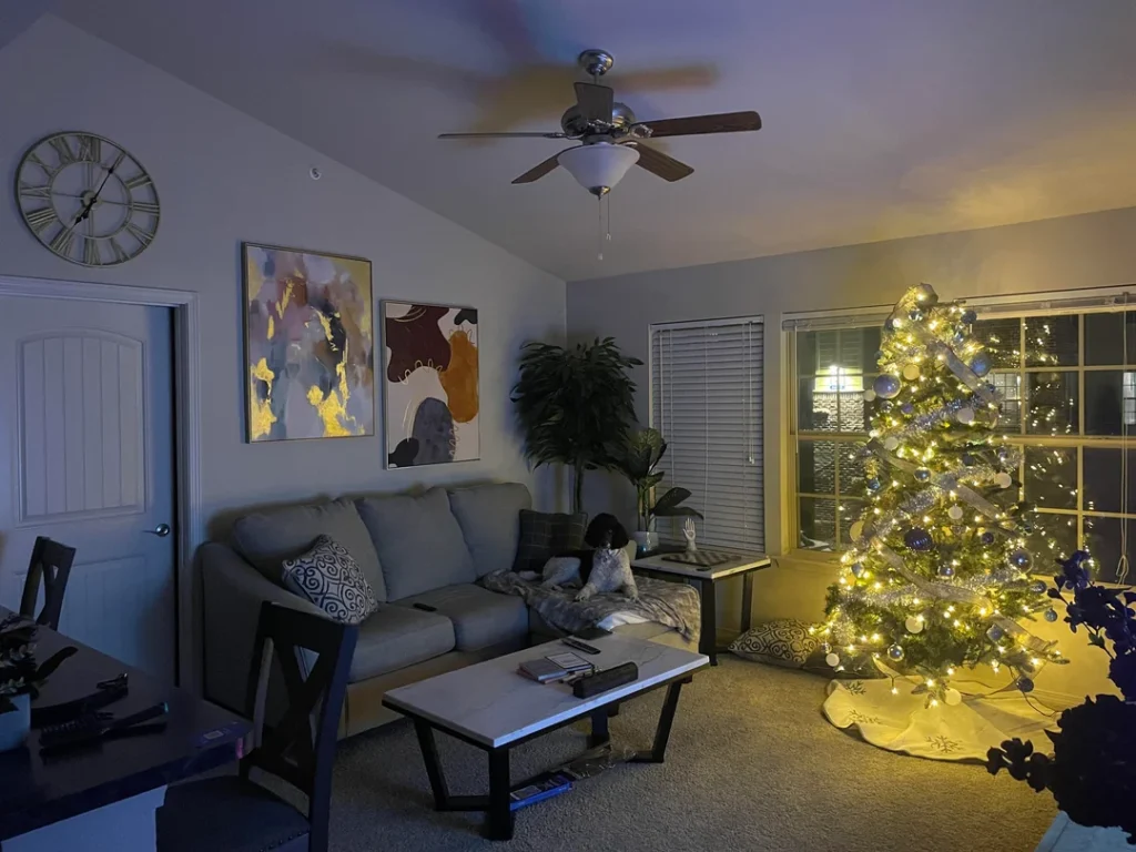 - A Christmas tree with warm white lights and silver-blue ornaments acts as a seasonal anchor