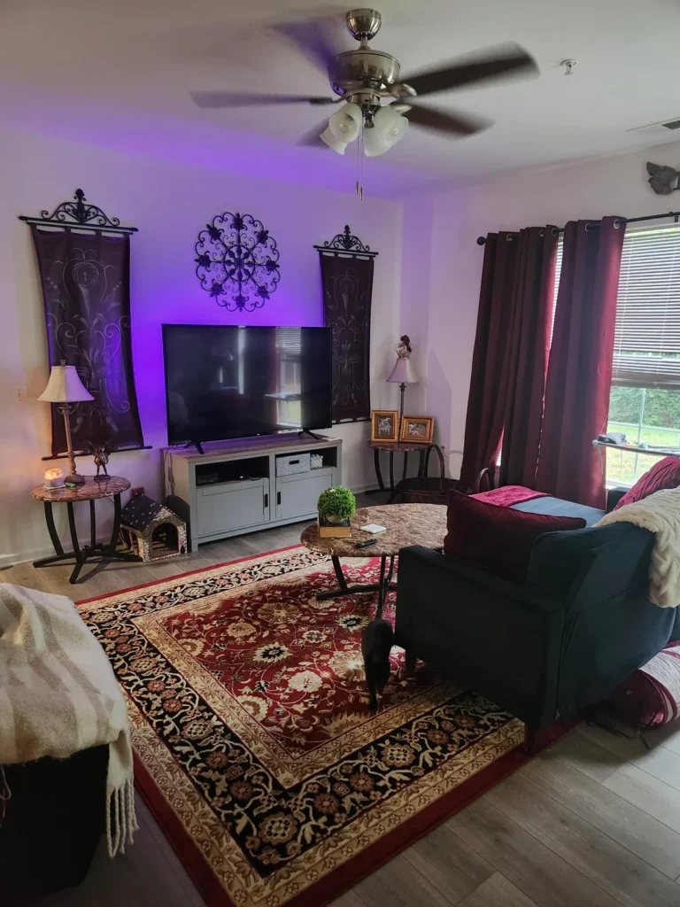 Start with your LED strip color and build your palette around it. Purple light reads warm against red and burgundy tones, and cool against blue or green. Once you lock in the dominant hue, source your curtains, rug, and throw pillows within that same color family.