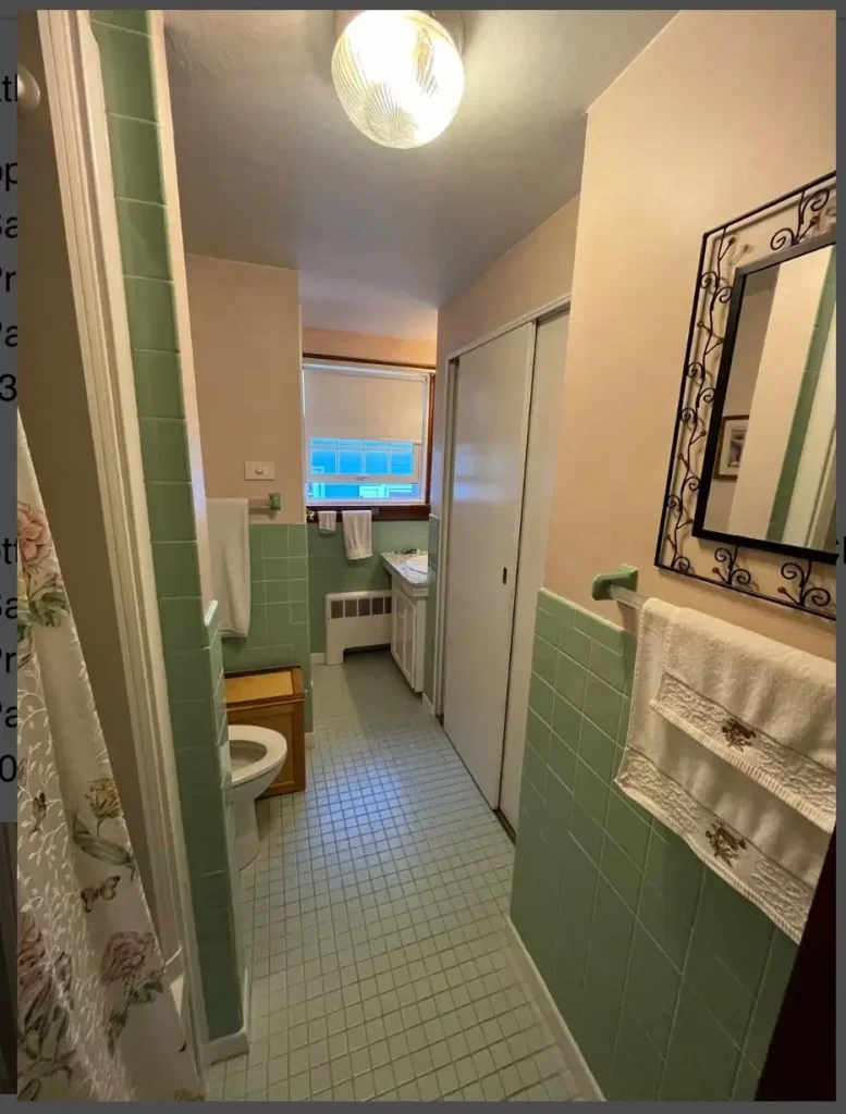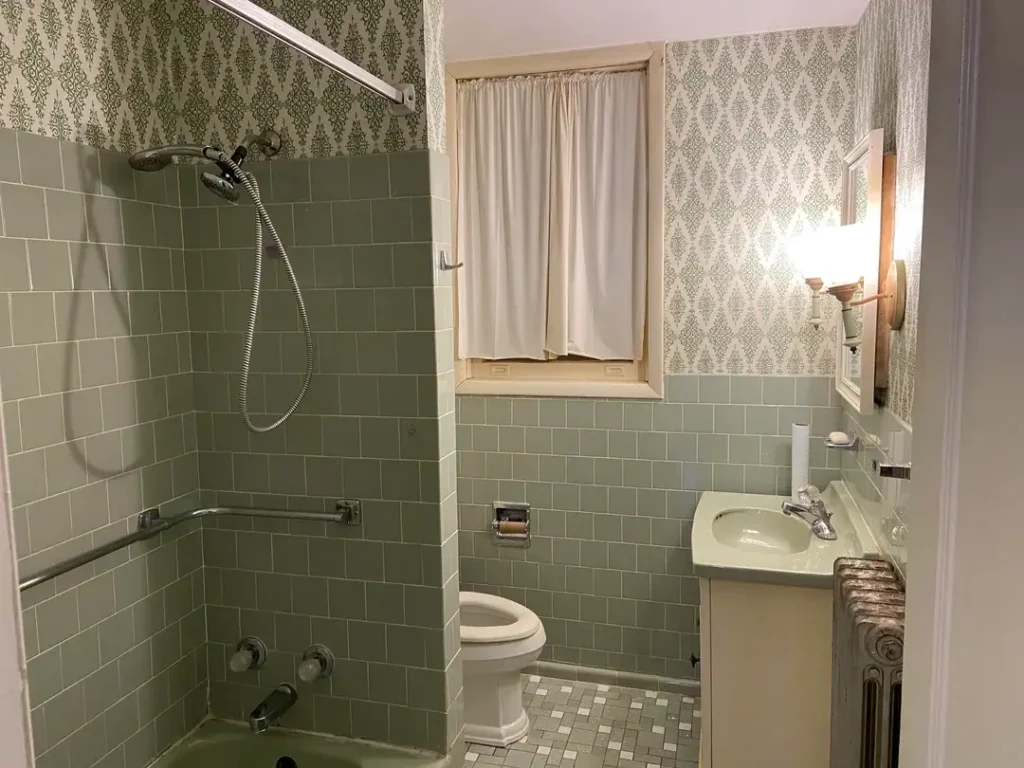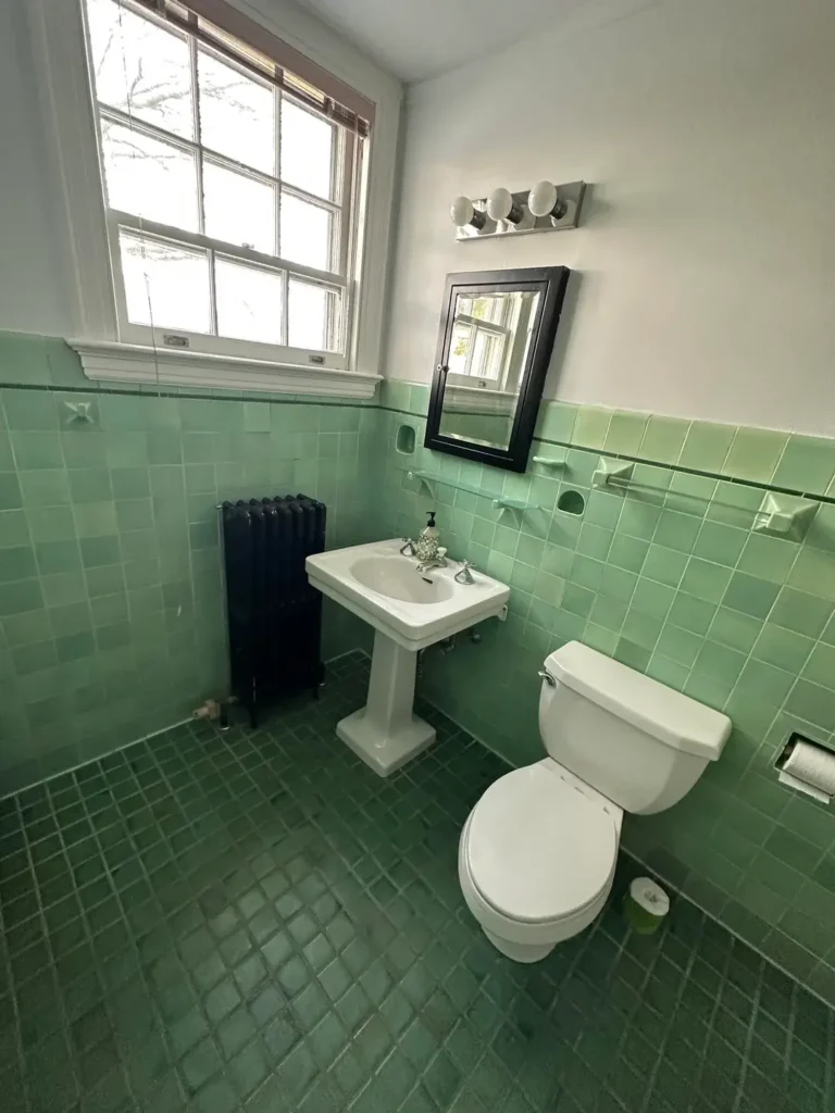 There’s a specific shade of green that only shows up in pre-war American bathrooms, and this bathroom has it. The tile is a warm jade-to-mint that shifts slightly depending on the light walls covered in larger 4×4 squares transitioning from a deeper green at the floor to a lighter tone near the window, with the darker, almost forest-green floor tiles creating contrast underfoot.