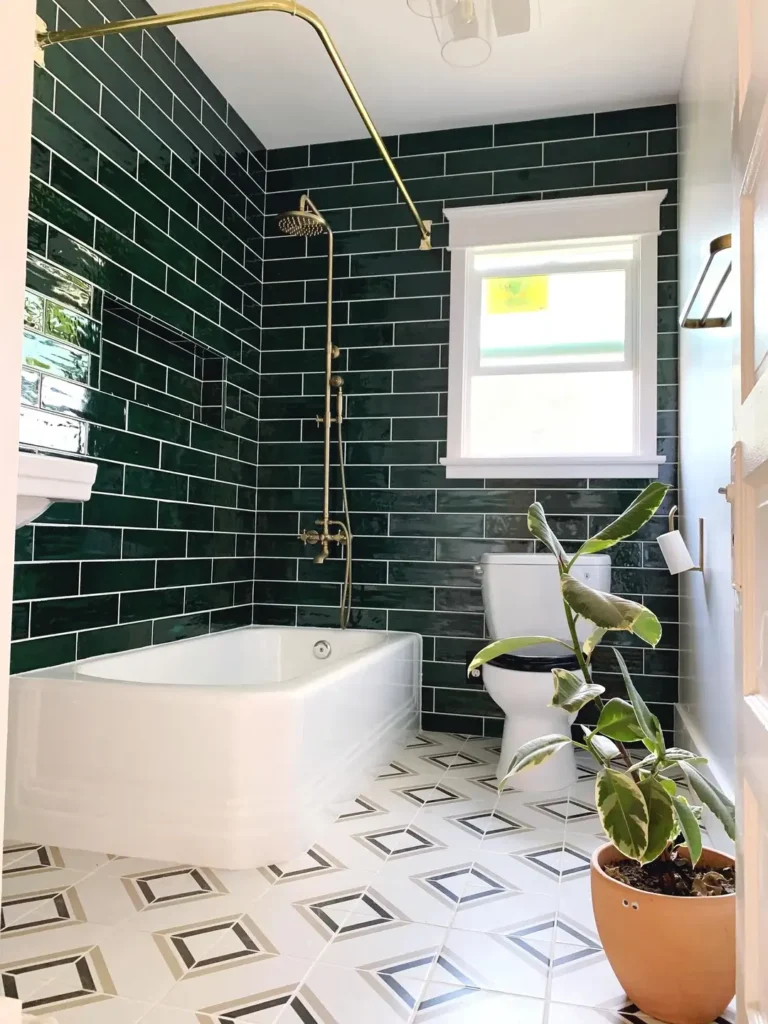 Forest Green Subway Tile with a Brass Exposed Shower and Patterned Floor: The Renovation That Got Everything Right