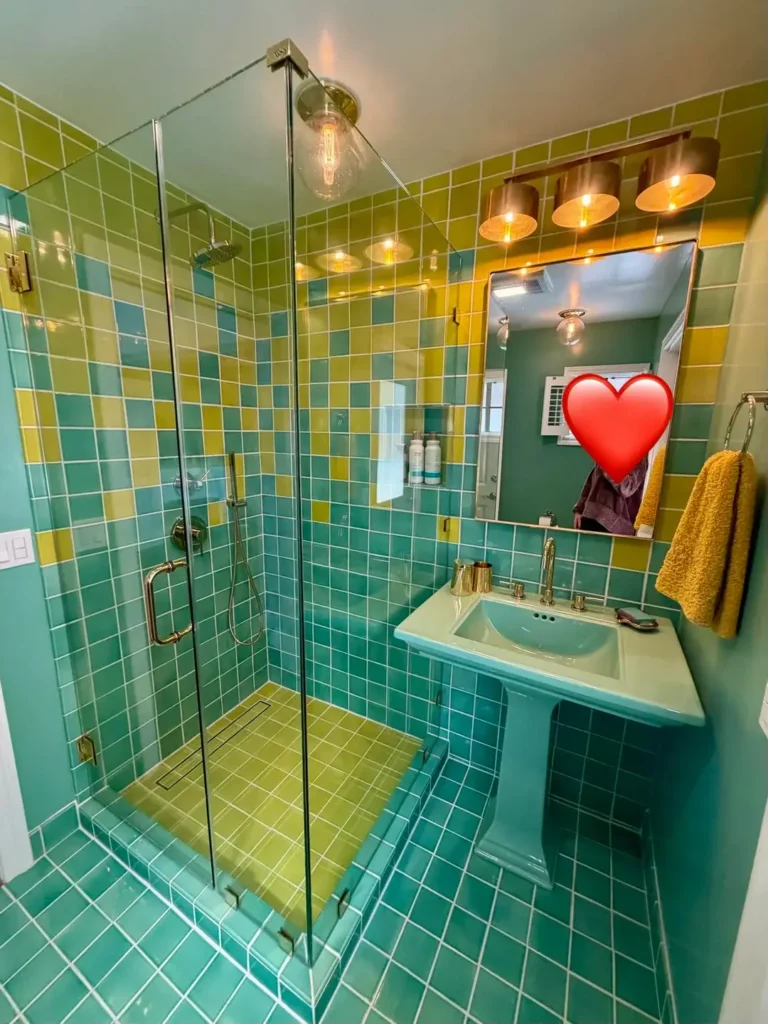 Most two-tone tile schemes involve one neutral. This one doesn’t. Turquoise-teal square tiles dominate the floor and lower walls while bright chartreuse-yellow-green tiles run in horizontal bands through the shower and somehow, it works.