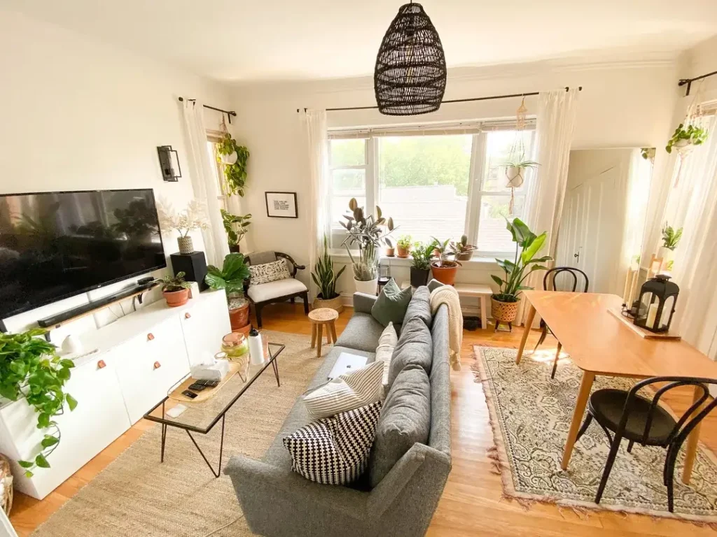 r/starbucksordunkin turned this long narrow space into an indoor garden that happens to include furniture. Plants line the windowsill, hang from the walls, cascade from shelves, and sit on every available surface. The gray sectional and natural wood dining table provide simple, unfussy backdrops that let the greenery take center stage.