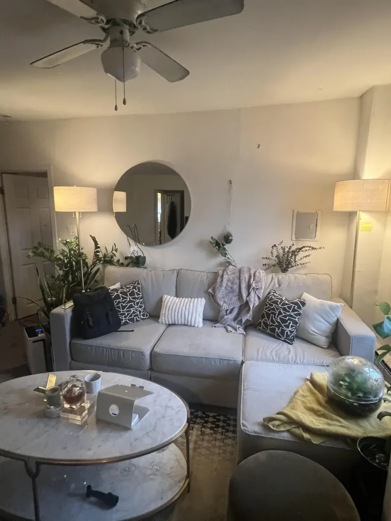 r/ModernUnicorn hung a large round mirror above a light gray sofa, doubling the perceived space by reflecting the opposite side of the room. The matching floor lamps flanking the sofa create symmetry that feels balanced and intentional. Black and white geometric pillows add pattern without introducing too many colors that would fragment the small space.