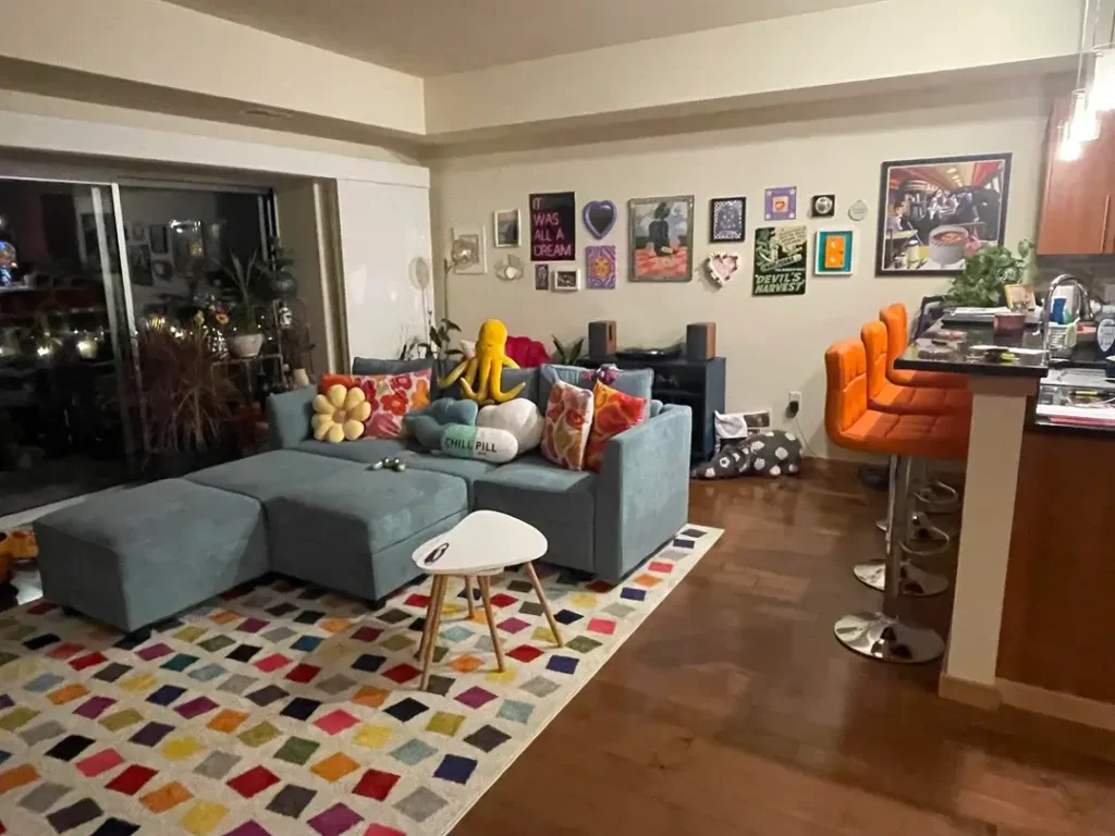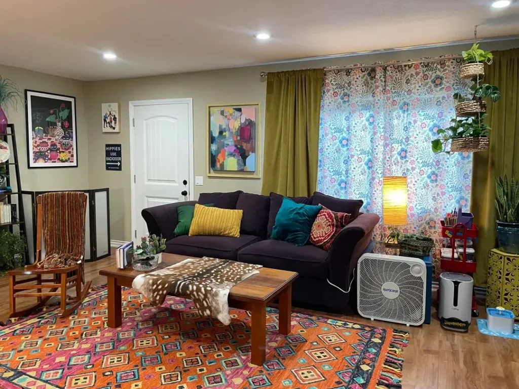 This living room r/youryellowumbrella created mixes teal and orange, geometric rugs with pop art, mid-century bar stools with contemporary sectional, and somehow it all works. The eclectic gallery wall includes everything from vintage posters to modern graphics in mismatched frames. Colorful throw pillows in yellow, red, and teal tie together the disparate elements.