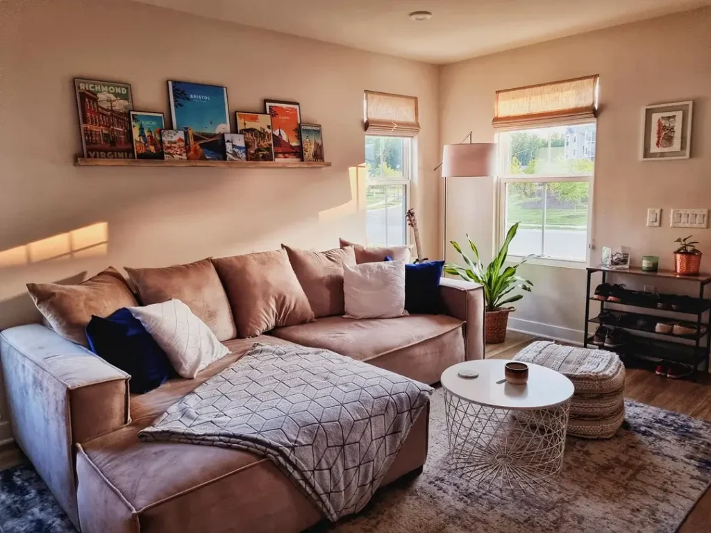 r/KrystianPL12 installed a simple ledge shelf to display overlapping travel posters from Richmond, Bristol, and other destinations. The casual overlapping arrangement feels collected over time rather than purchased as a set, which immediately makes the space feel more genuine. The soft blush walls provide a subtle backdrop that doesn’t compete with the colorful posters.